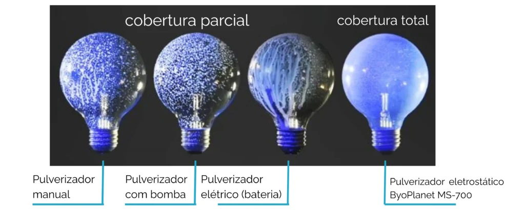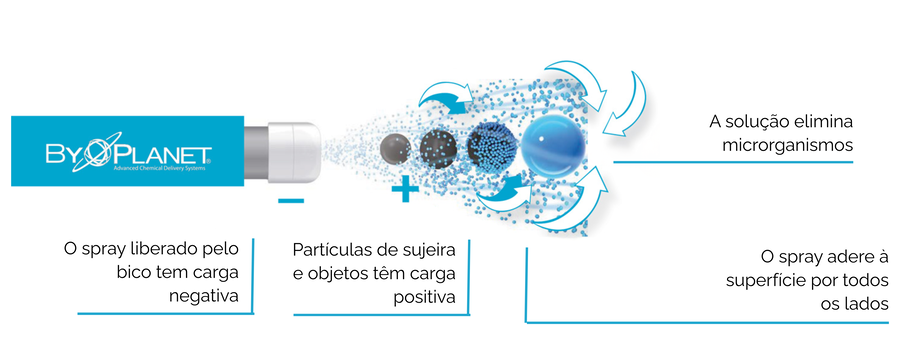 A tecnologia de indução eletrostática ByoPlanet® redefine a higienização de ambientes, proporcionando uma cobertura completa, uniforme e altamente eficiente. Suas microgotículas eletricamente carregadas são naturalmente atraídas pelas superfícies, envolvendo cada ponto de contato – inclusive nas áreas mais difíceis de alcançar.