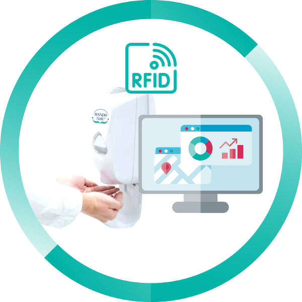 A tecnologia RFID (Identificação por radiofrequência) usada no smart dispenser Hands Safe registra a data e horário de cada utilização, monitorando a solução alcoólica por diversas vertentes: